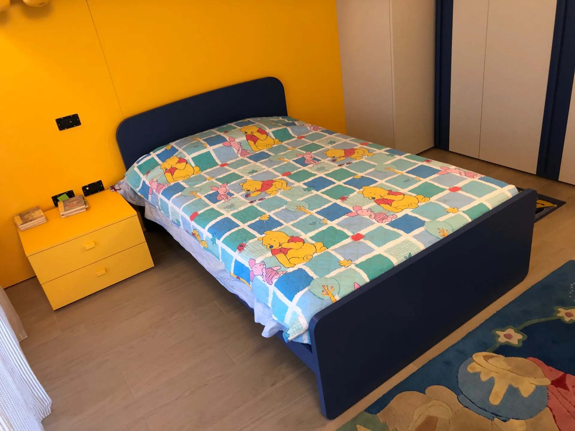 The bedroom is furnished with sand-coloured matt lacquered wooden furniture