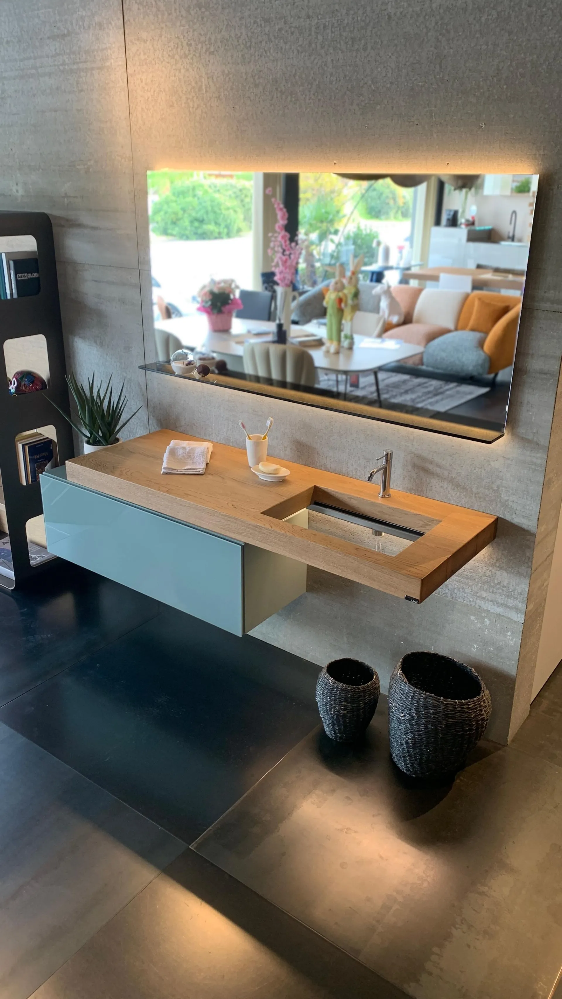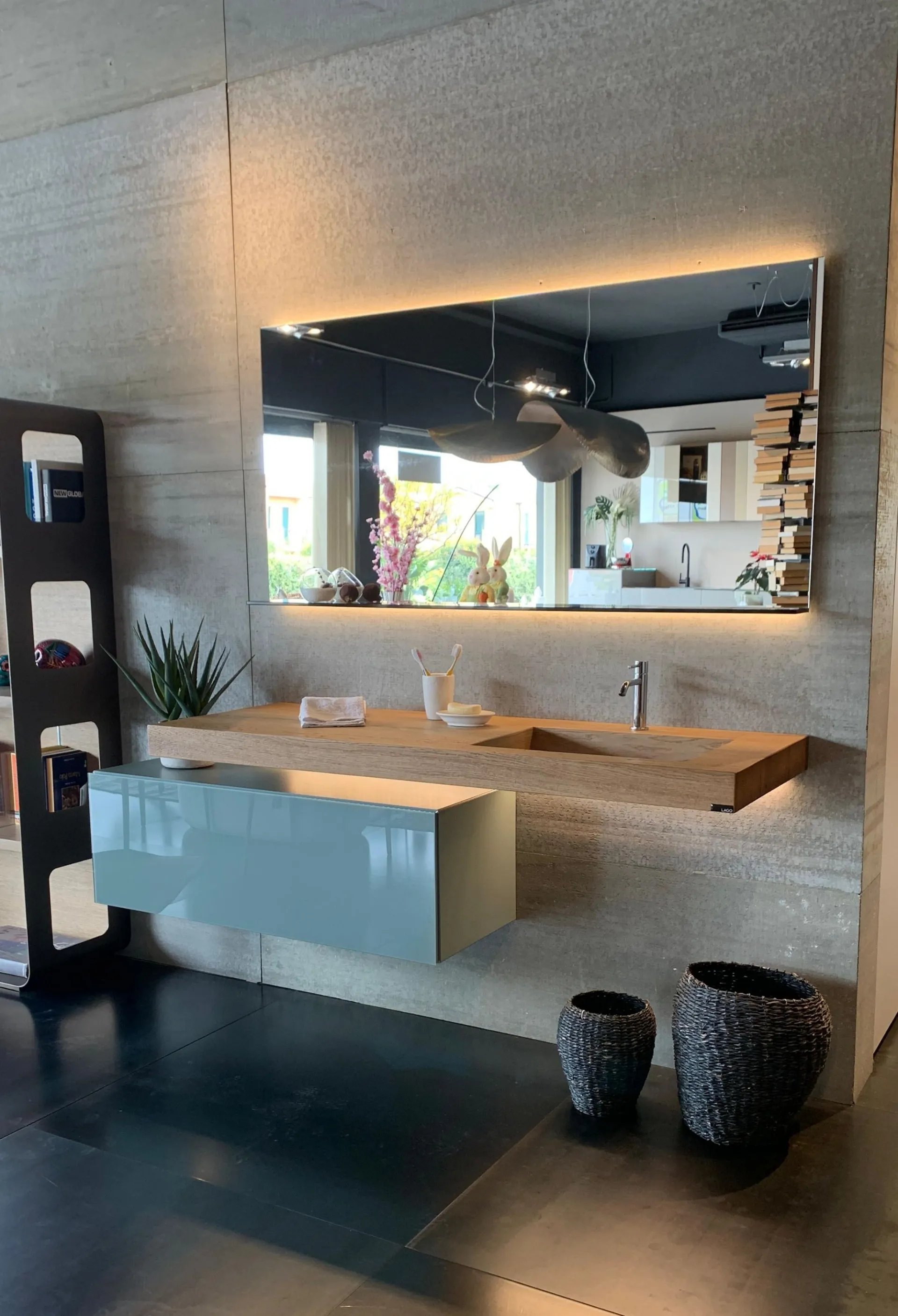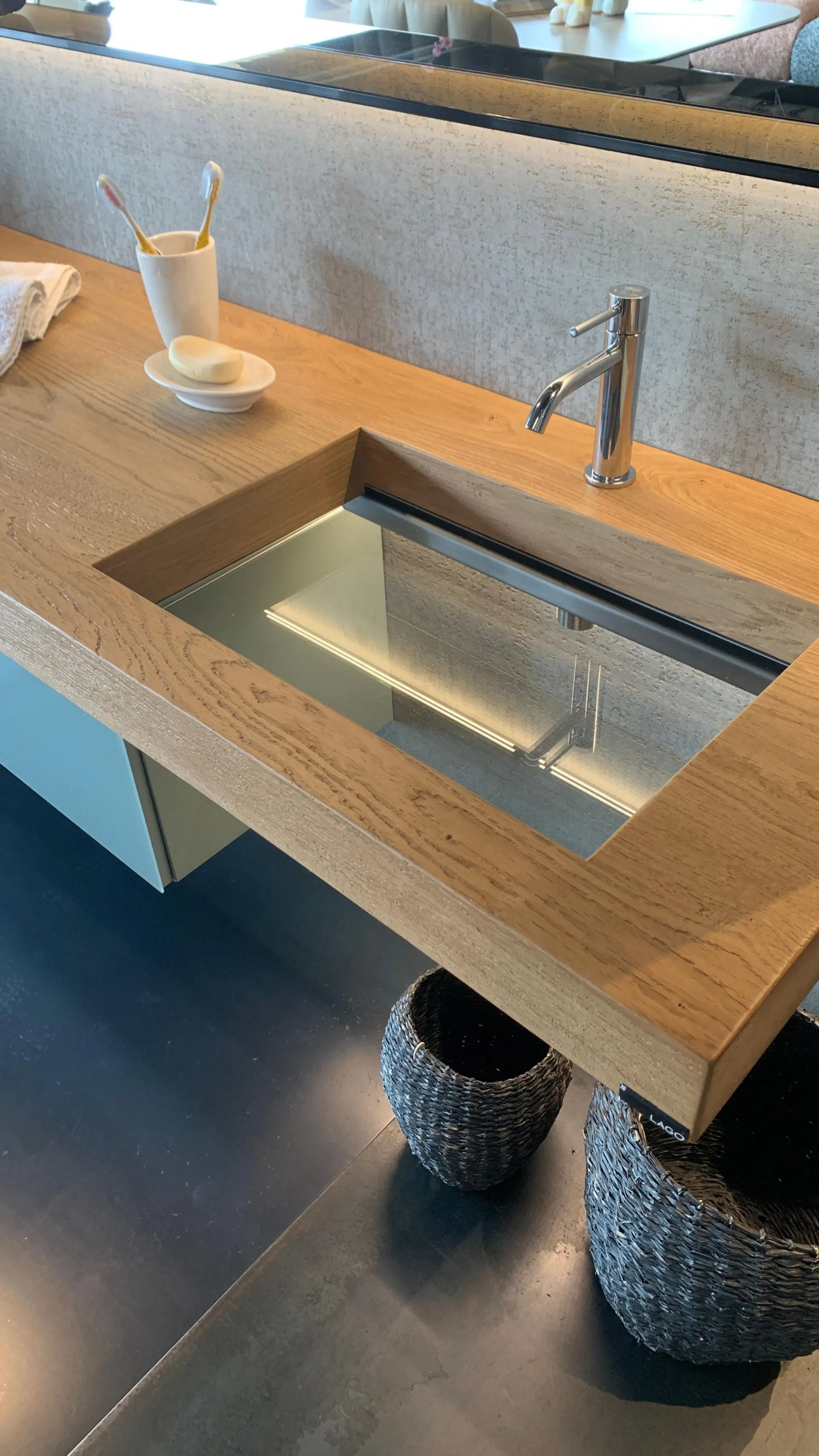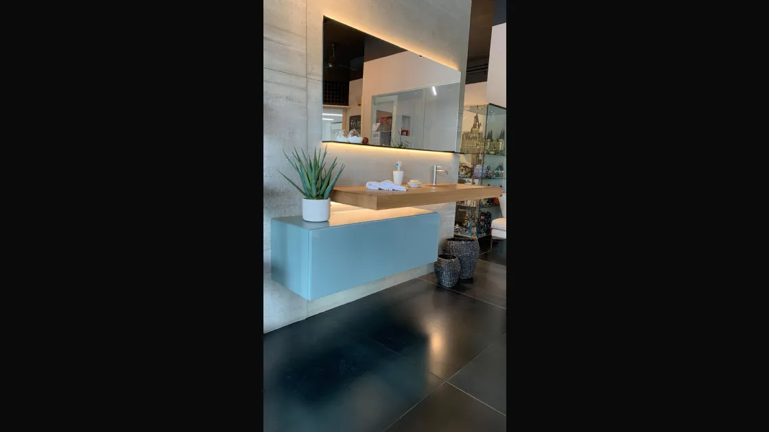 PRODUCT: Bathroom Composition COMPANY: Lago MODEL: Depth / 36e8 / Glasserie FINISH: Basket 36e8 in lacquered wood with front in glossy glass in ARGILLA color + Depth washbasin in natural Wildwood oak finish with tempered transparent glass basin + Glasserie mirror with shelf in smoked bronze tempered glass, 2 LED lights on the long sides included with power supply DIMENSIONS: - Washbasin: 150 cm W, 52 cm D, thickness 8 cm - Basket: 110.4 cm W, 40.6 cm D, 36.8 cm H - Mirror: 150 cm W x 73.6 cm H x 12.5 cm D TOTAL DIMENSIONS: (Assembled in exhibition) W 184 cm x D 52 cm x H 185 cm LIST PRICE: €6,541.00 DISCOUNT: 35% DISCOUNTED PRICE: €4,250.00