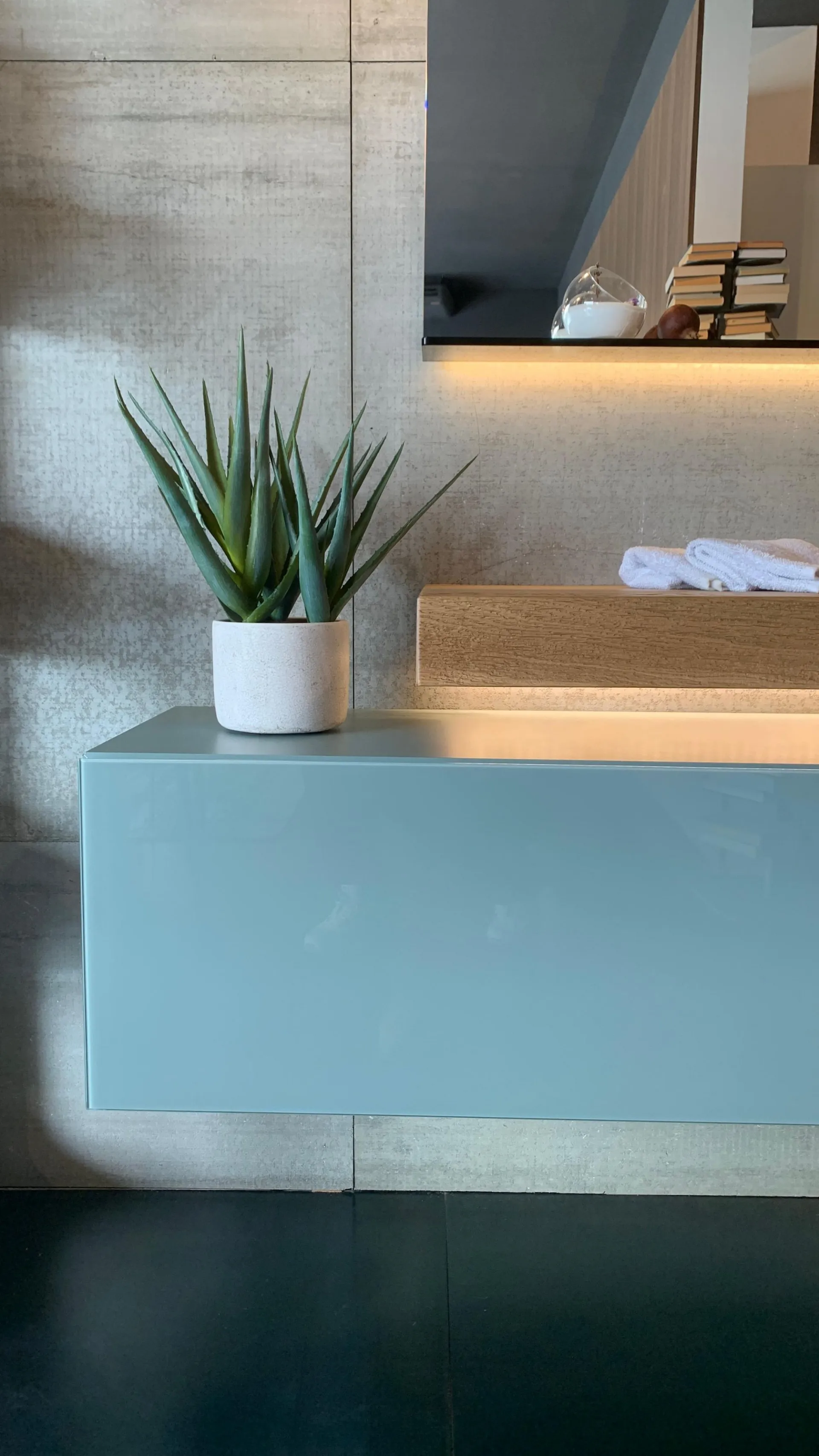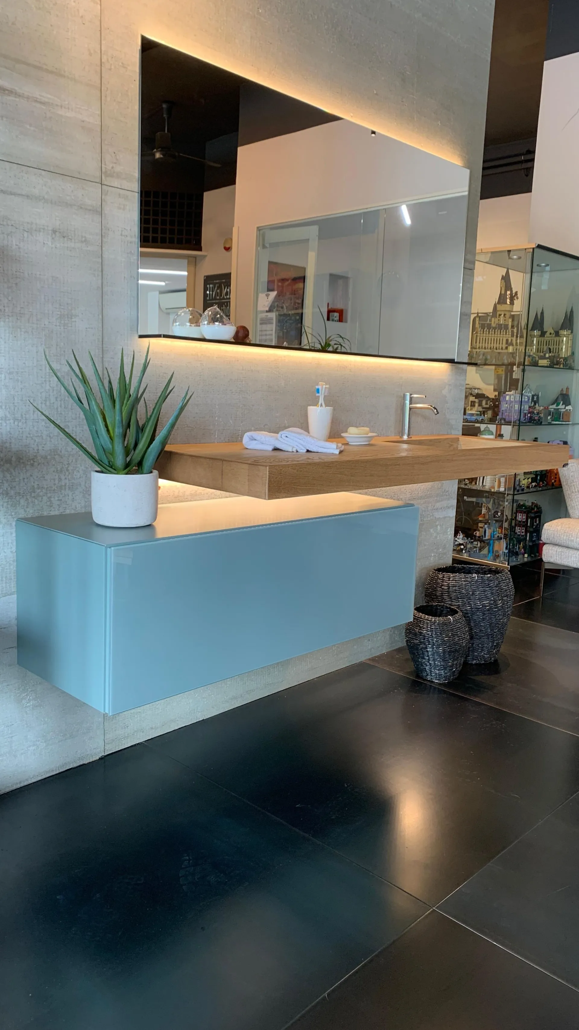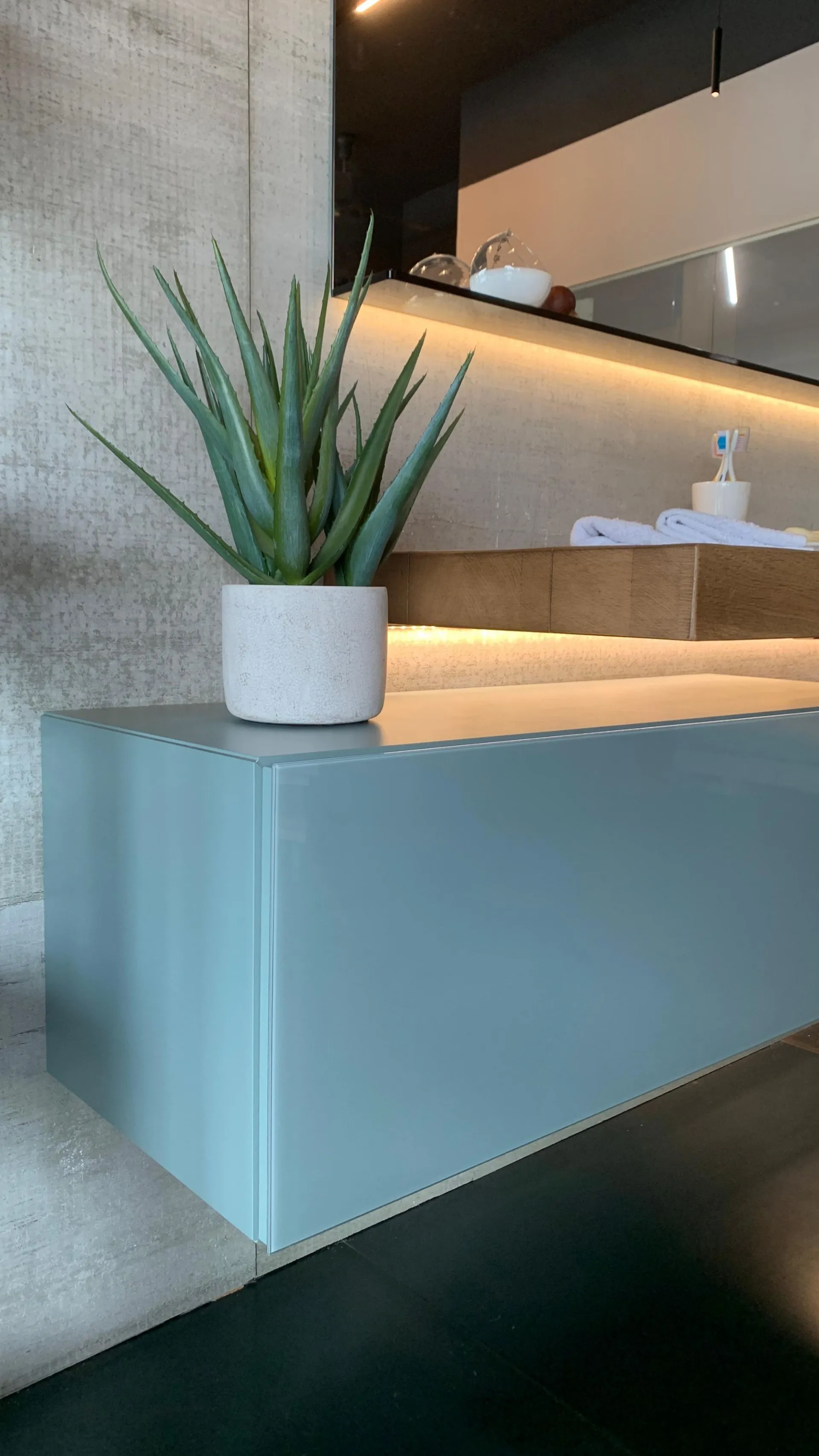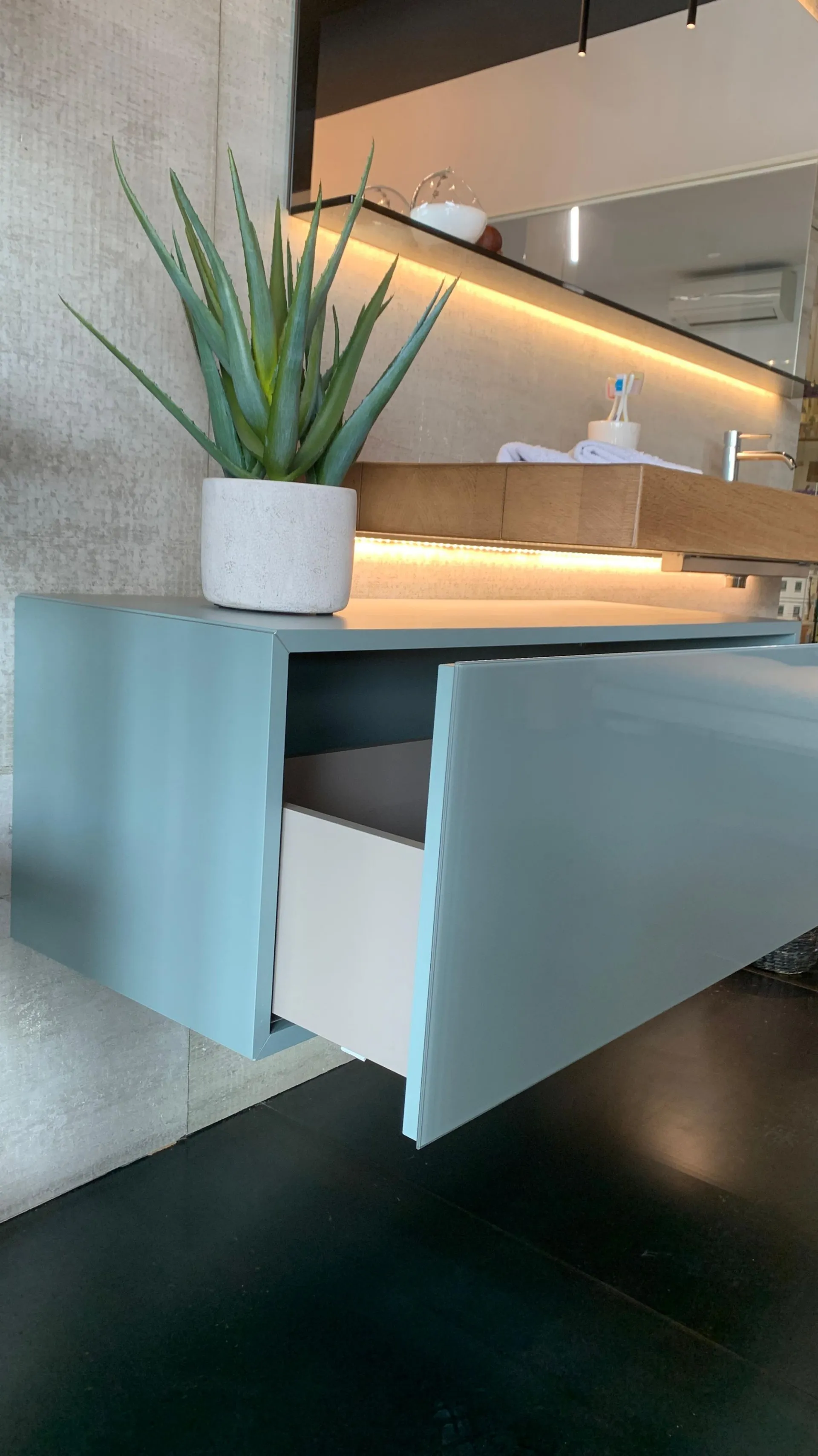 PRODUCT: Bathroom Composition COMPANY: Lago MODEL: Depth / 36e8 / Glasserie FINISH: Basket 36e8 in lacquered wood with front in glossy glass in ARGILLA color + Depth washbasin in natural Wildwood oak finish with tempered transparent glass basin + Glasserie mirror with shelf in smoked bronze tempered glass, 2 LED lights on the long sides included with power supply DIMENSIONS: - Washbasin: 150 cm W, 52 cm D, thickness 8 cm - Basket: 110.4 cm W, 40.6 cm D, 36.8 cm H - Mirror: 150 cm W x 73.6 cm H x 12.5 cm D TOTAL DIMENSIONS: (Assembled in exhibition) W 184 cm x D 52 cm x H 185 cm LIST PRICE: €6,541.00 DISCOUNT: 35% DISCOUNTED PRICE: €4,250.00