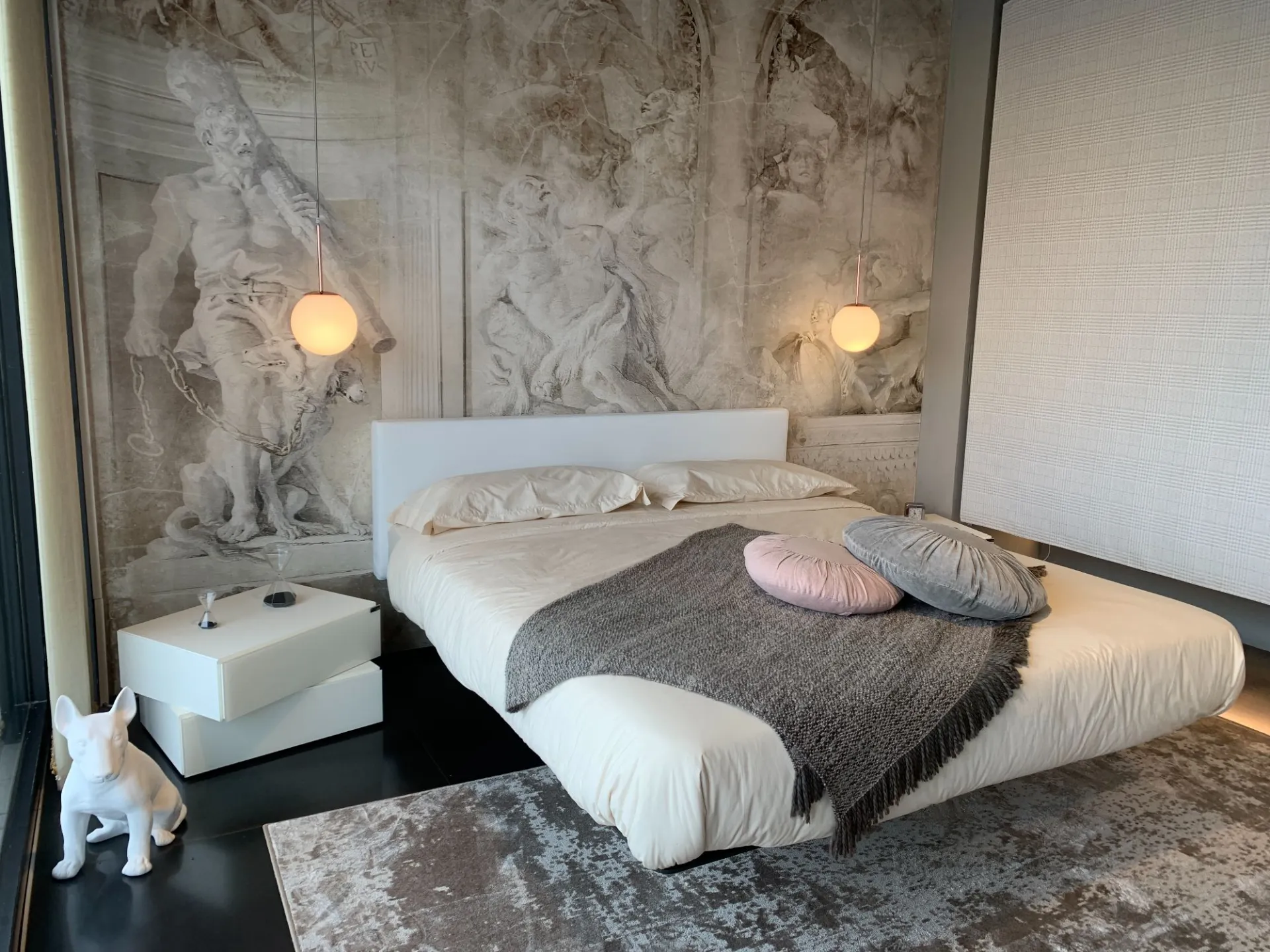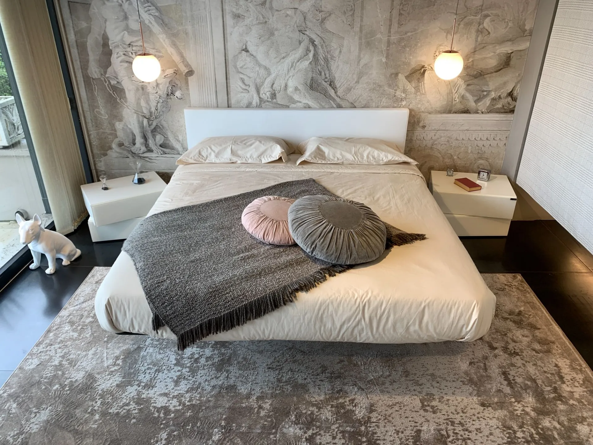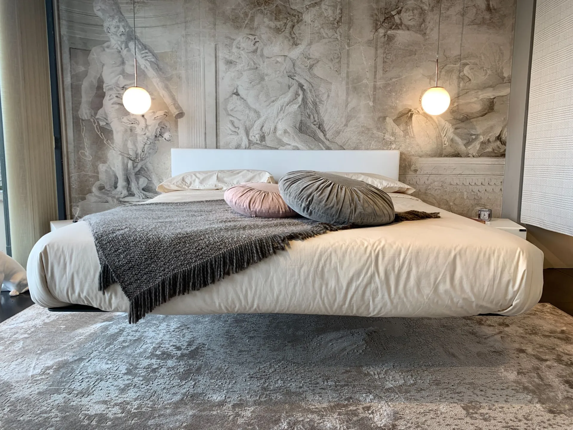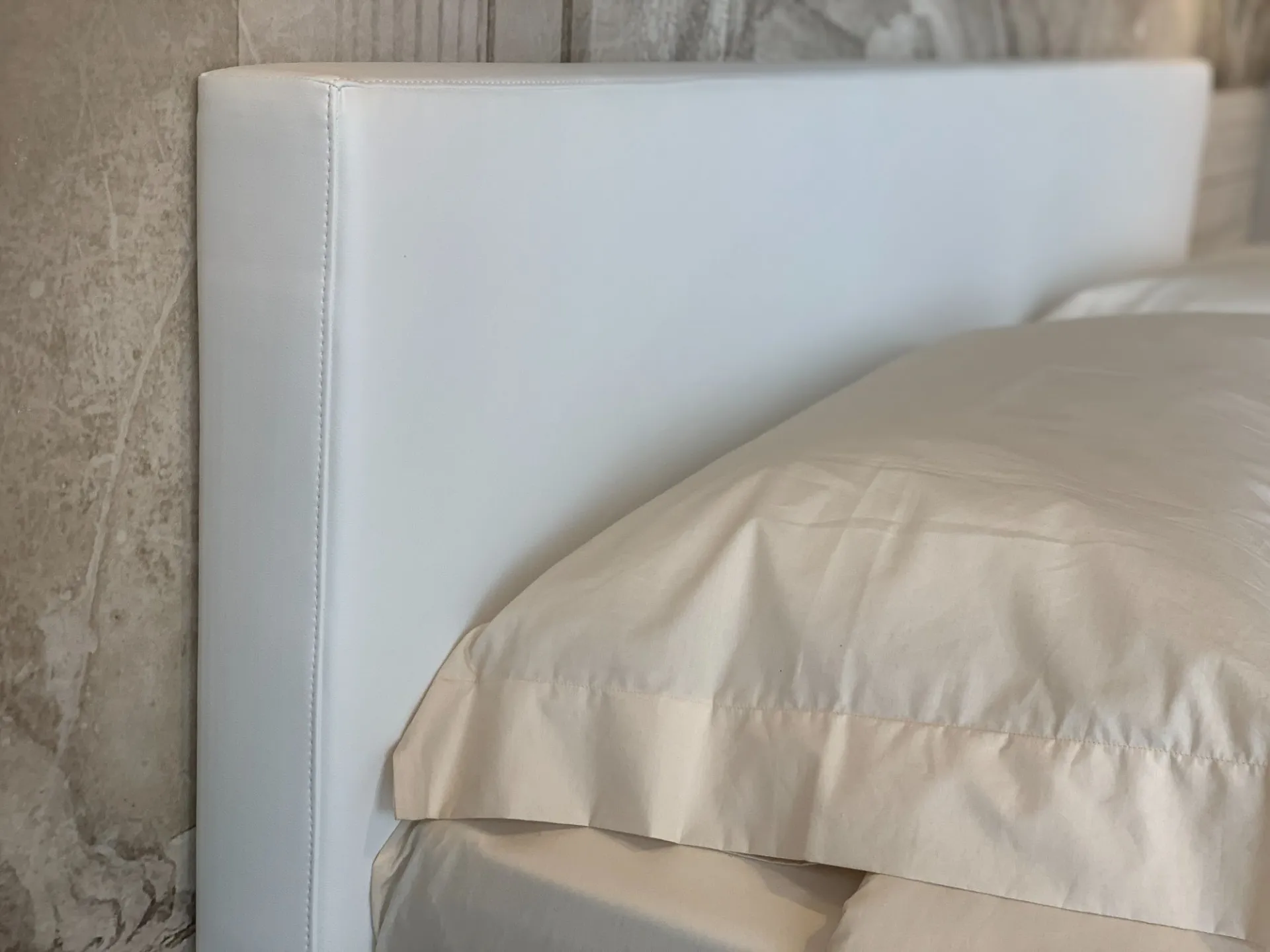 PRODUCT: Double Bed COMPANY: Lago MODEL: Fluttua 180x200 FINISH: Platform bed with HPL structure, tubular metal frame. Headboard H 56 cm thickness 8 cm, removable, covered in white eco-leather cat B. DIMENSIONS: L 180, H 88 adjustable during assembly, W 208 CM (For mattress size 180x200 cm) LIST PRICE: € 4,668.00 DISCOUNT: 35% DISCOUNTED PRICE: € 2,990.00 AVAILABLE ACCESSORIES: