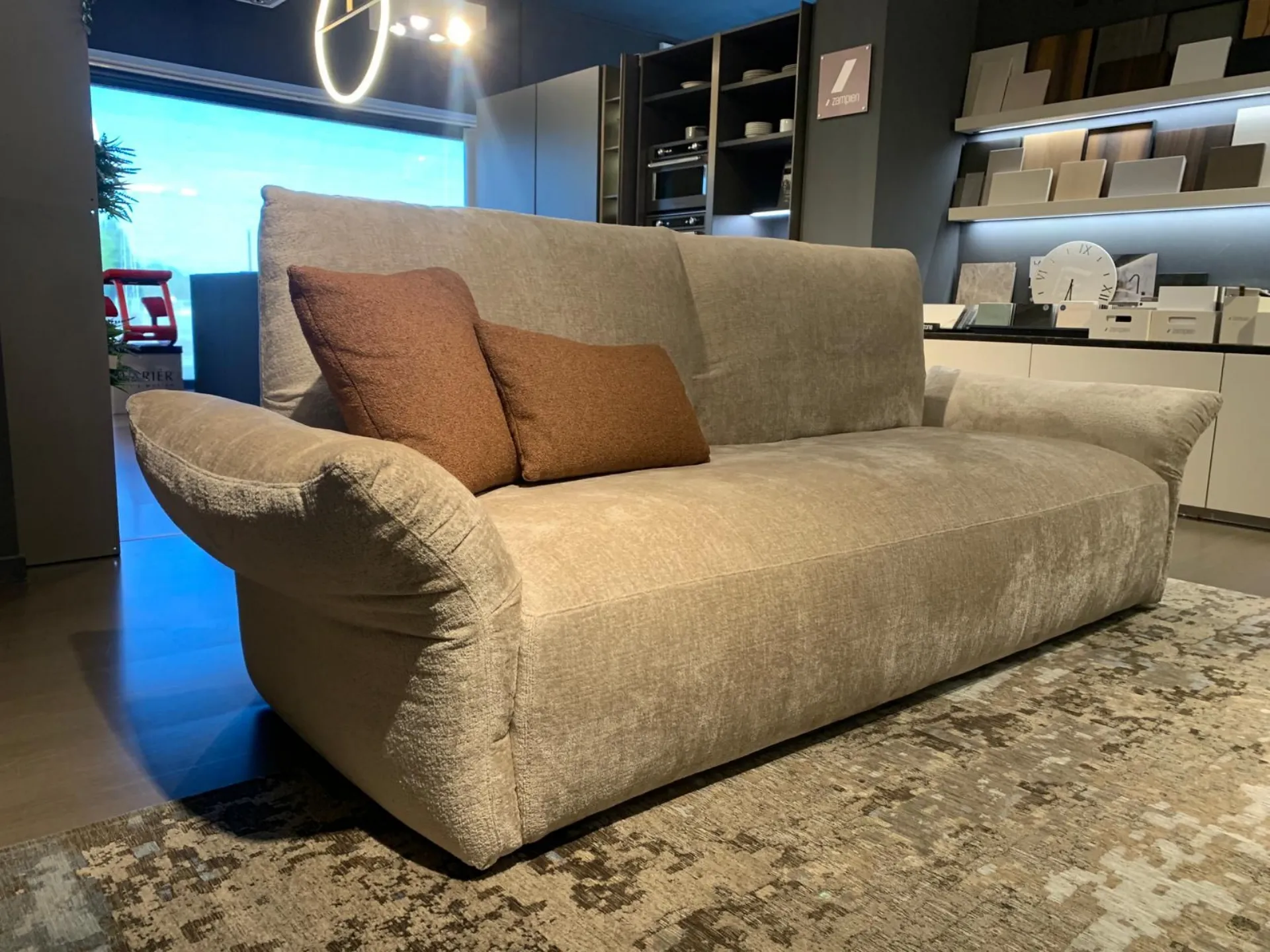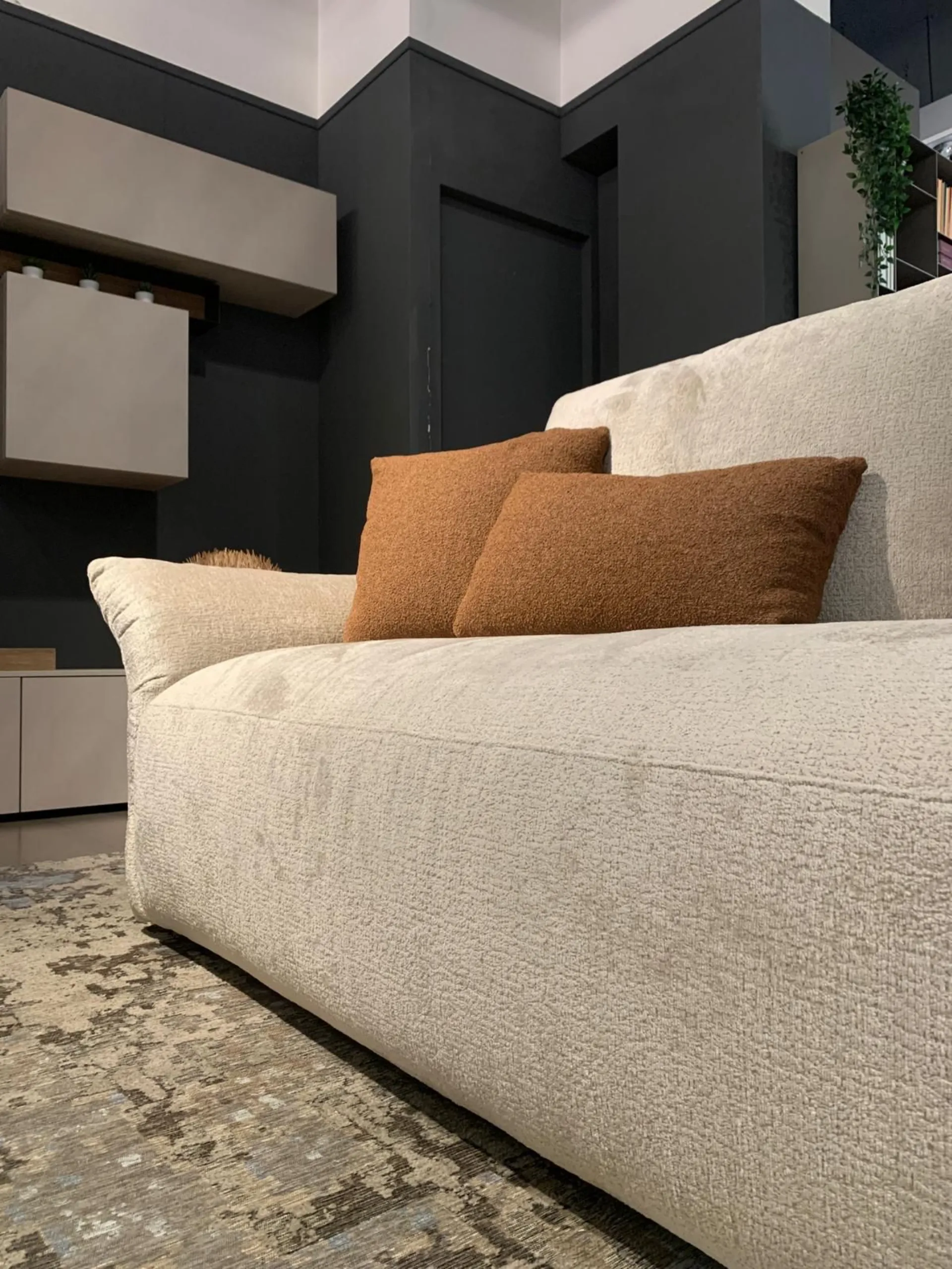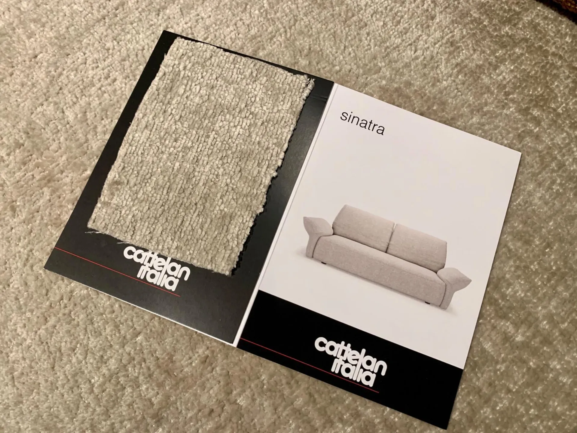 PRODUCT: Linear Sofa COMPANY: Cattelan Italia MODEL: Sinatra S250 FINISH: Structure in plywood, composite wood, and metal. Spring system with elastic straps. Upholstery in polyurethane foam with different densities and resin-coated synthetic fiber lining, back cushion upholstery in polyurethane with variable density (40 + 38 + 35), fiber and feather quilted filling with resin-coated synthetic fiber lining. ABS feet. Removable covering in fabric cat.B (B056). Includes 2 flying cushions Bliss model, one of 45x45 cm and one of 55x30 cm in fabric cat. A (A009) Softness: Semi-soft - (5/10) DIMENSIONS: L 250 cm, D 100 cm, H 94/99 cm - Seat H 44 cm, Armrest H 57 cm LIST PRICE: €6,269.00 DISCOUNT: 25% DISCOUNTED PRICE: €4,700.00