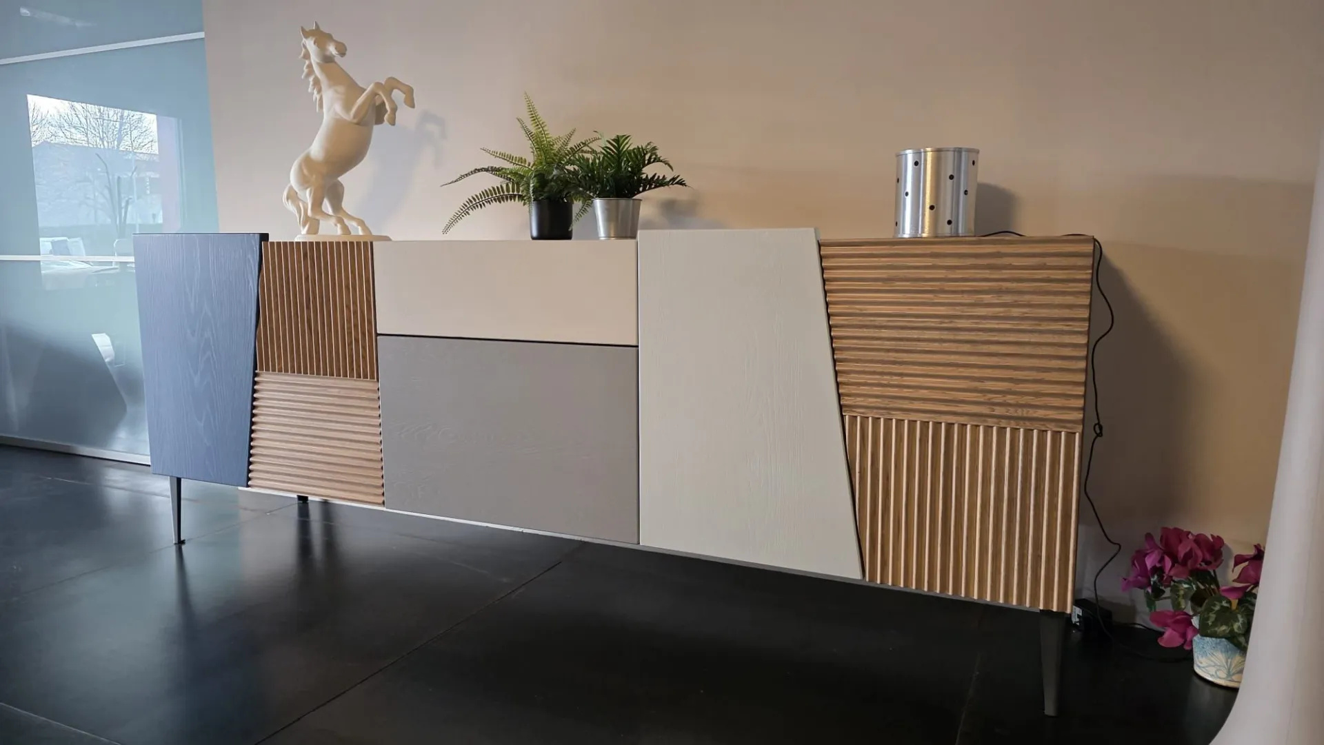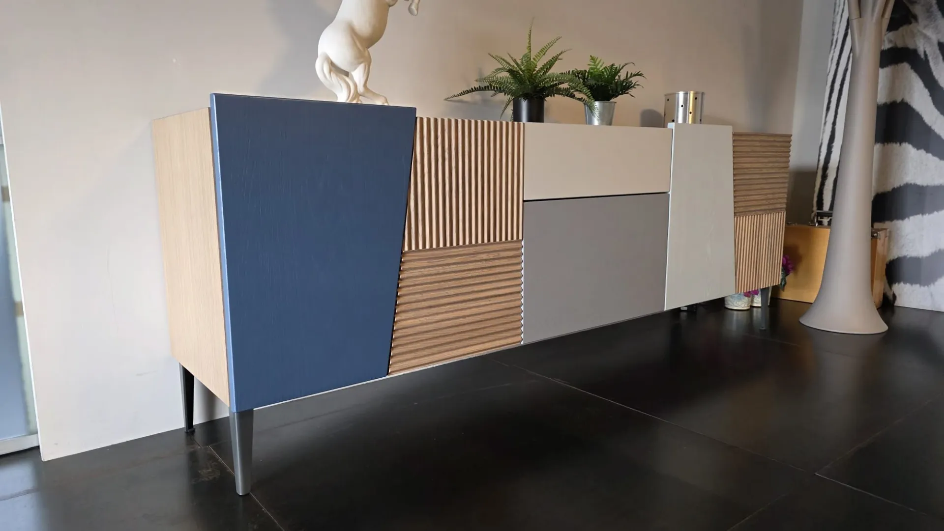 FINISH: Feet in Anthracite iron finish H 20 cm, Oak HOLAND GRAY structure, 5 swing doors and 1 drawer in oak finish HOLAND GRAY, OTTANIO, TITANIO, CORDA, ACQUAMARINA, internal shelves oak Holand Gray