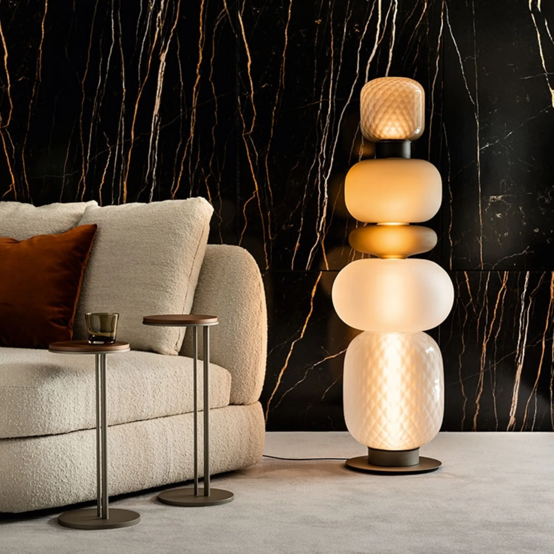 In our store, we offer the most efficient lamps on the market to meet every need: the most original quality proposals are waiting for you. The world of lamps has its own specific language, but at the same time, it interacts with the furniture in your home, mixing practical qualities with aesthetic ones. The lamp in the photo emits a pleasant light and its design fits effortlessly in rooms with various styles of decor, always enhancing the aesthetics to the fullest. It does not impose any stylistic constraints: the Pigalle floor lamp by Cattelan Italia in glass stands out for its quality finishings and technology.