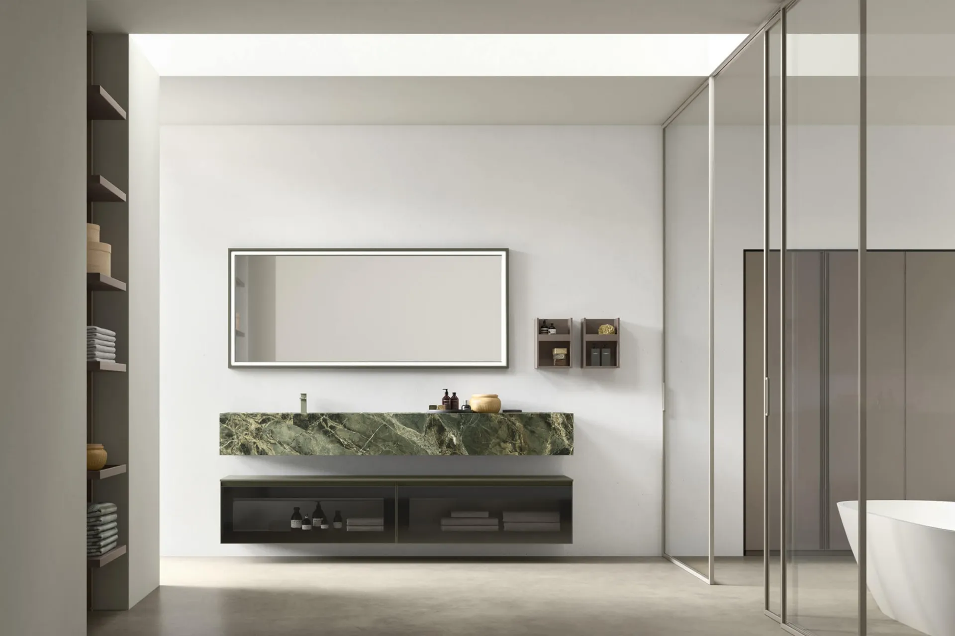 The bathroom is no longer just a service room: nowadays, the same attention is dedicated to its design as to the other domestic spaces. The bathroom furniture design of the main brands guarantees compositional solutions to create environments of great design and well-furnished. The proposals of the renowned brand are always built with excellent materials, capable of withstanding the action of humidity and cleaning agents over the years. In store you will find not only sanitary ware, but also all the other accessories integrated in the bathroom project: discover the most original proposals for suspended bathroom furniture. The model of the suspended bathroom cabinet Shape 34 by Arcom in glass enhances the room combining qualities of elegance with functionality and ergonomics.