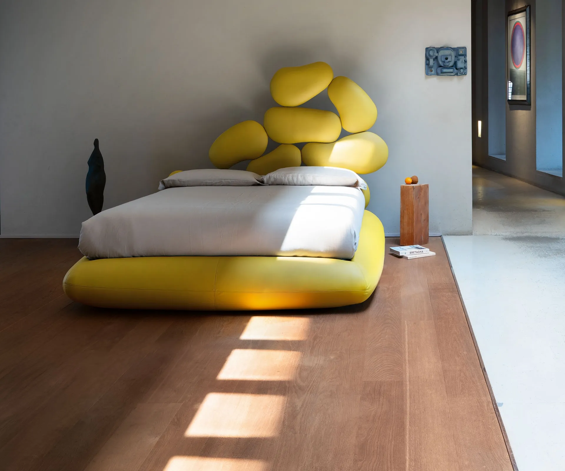 Discover a rich catalog of upholstered beds from the best Furniture House brands available in our showroom and enhance your bedroom. If you want to ensure the utmost comfort during your moments of relaxation, choose the double beds in leather design like the model shown in the photo. On our website, you can find the most valid proposals from the best brands specializing in bedroom furniture, with a wide possibility of customization in terms of colors and combinations, accessories and much more. The Design Stones Bed by Noctis is one of the most beautiful solutions from the brand, a specialist in rest, capable of ensuring functionality, comfort and a unique style.