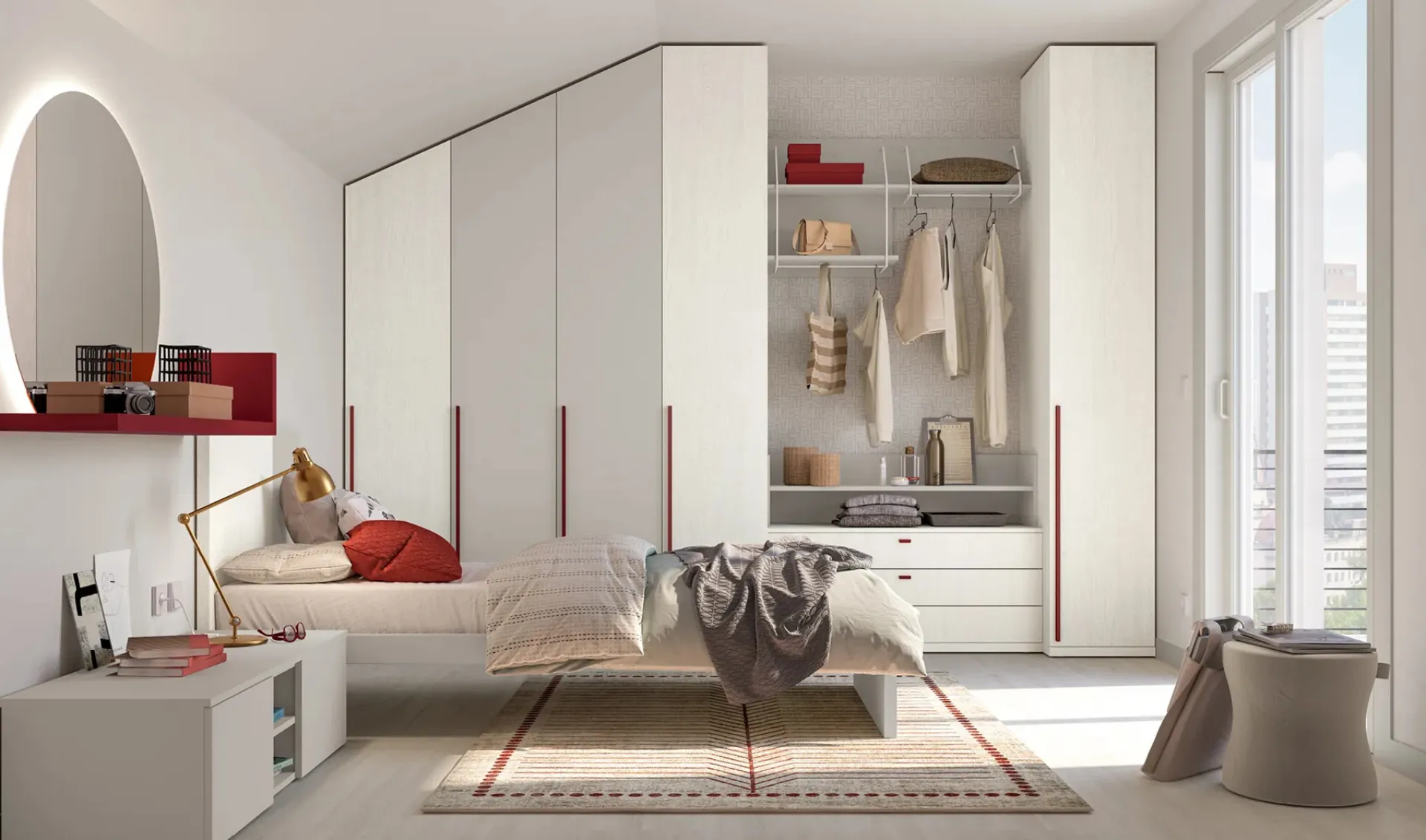 The accessories available for Doimo Cityline's custom-made children's bedrooms are always adaptable, to prevent any space and functionality issues. If the room is small, Doimo Cityline offers a variety of solutions that combine ergonomics and safety. The custom-made bedrooms for teenagers from the well-known and renowned brand are available in different versions, always meeting the needs of children. Discover in our showroom the Layout 10A children's bedroom from Doimo Cityline in melamine: it is perfect for creating a welcoming, beautiful, and well-organized environment.