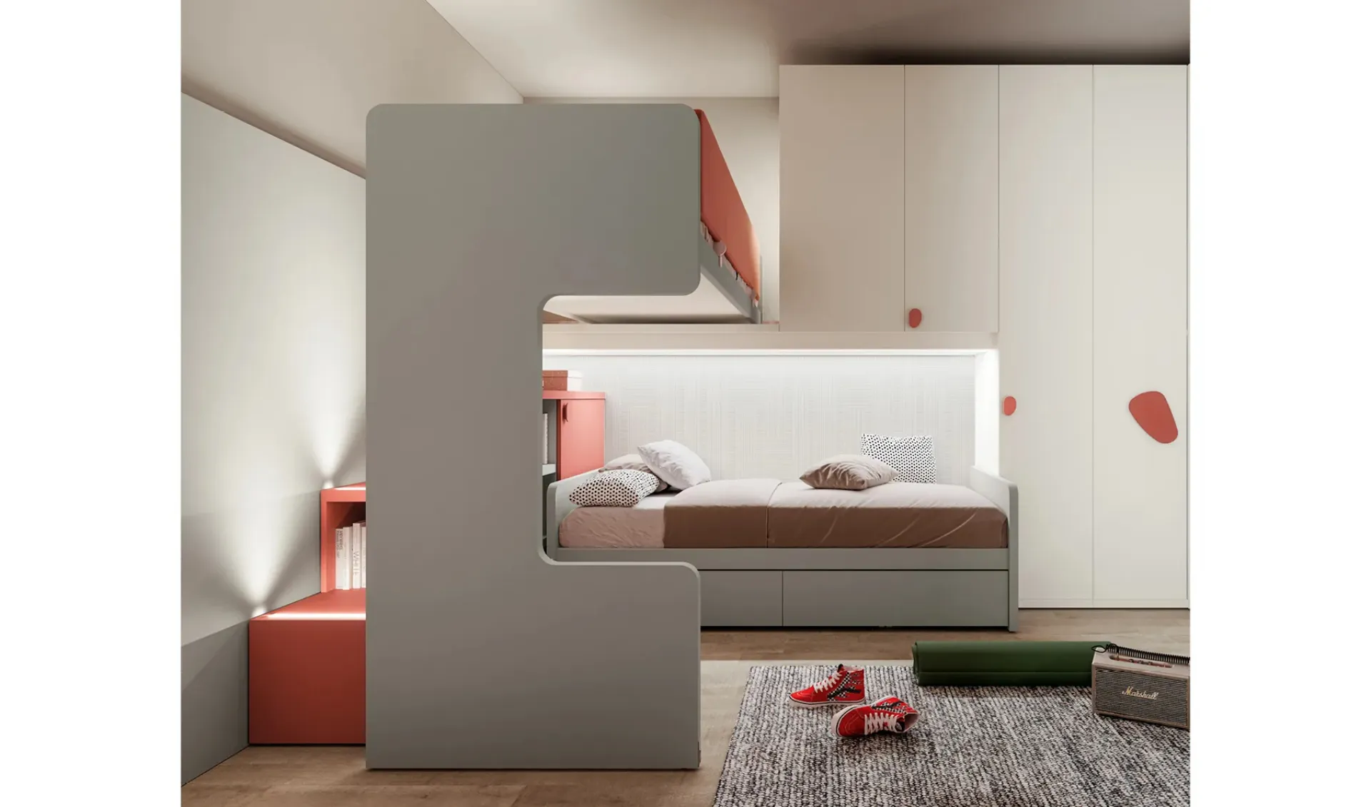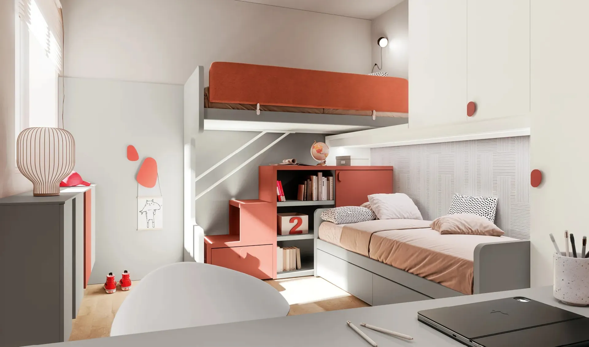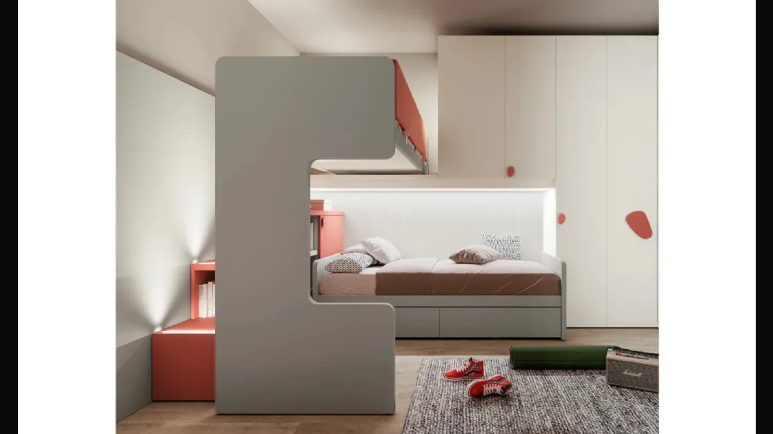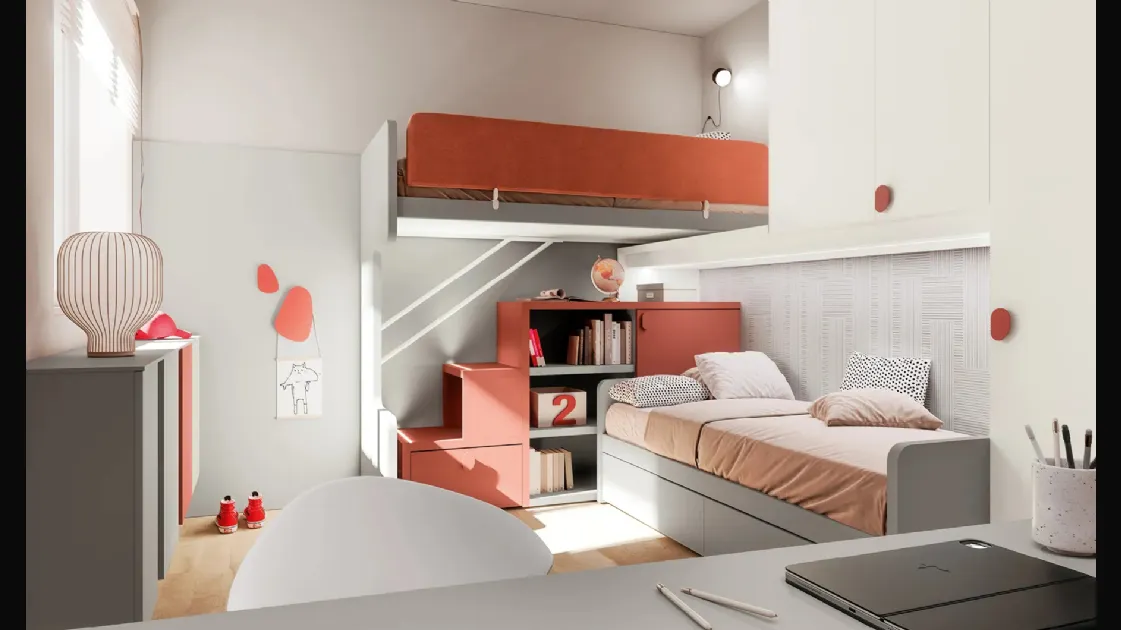 With the Layout 16B children's room by Doimo Cityline in melamine, you will ensure a perfect combination of functionality and ergonomics, ideal for your children's room. We offer a variety of modern loft children's rooms from the brand in store, perfect for accompanying them during their growth. Our children's rooms are the environment in which they will grow up having fun and dreaming, so it is essential that the space is practical. In store, we take care of guiding you from the choice of furniture for the room to the design of the place where your children will grow up, having fun and dreaming.