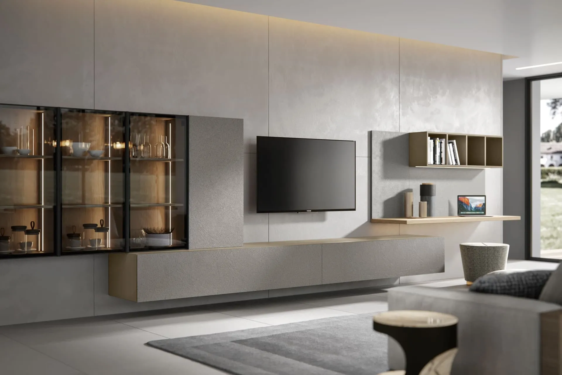 Wall units have become fundamental in the living area of our homes: they are multi-functional and space-saving furniture always customizable for you. This wall unit is one of the solutions offered by the company and will allow you to design your living room following specific housing issues. Through a dynamic combination of open and closed components, modern wall units furnish the living room, enhancing every space.