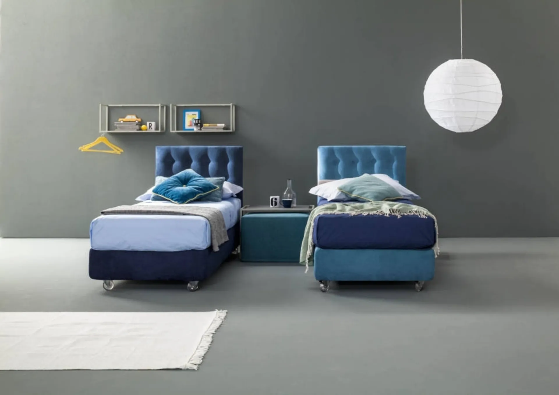 A rich catalog of modern fabric beds awaits you: the Bside brand offers different versions of beds that always meet children's needs. The single upholstered beds for children's rooms available in store solve any space and practicality issues, while ensuring a unique style. Learn more about the Aster single upholstered fabric bed by Bside in the photo: it is ideal for creating a beautiful and well-organized environment for children.