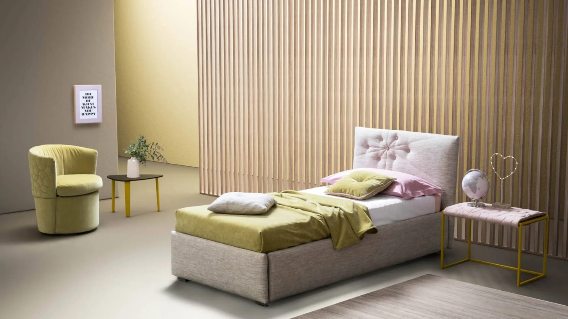 If you're looking for modern furniture and accessories, the single bed in the image is perfect for you: it belongs to our series of upholstered single beds. This is one of the most original products from the Bside brand, synonymous with durability, quality materials, and unique design. Contact us and get information about our series of fabric single beds: furnish the bedroom as you dreamed of.