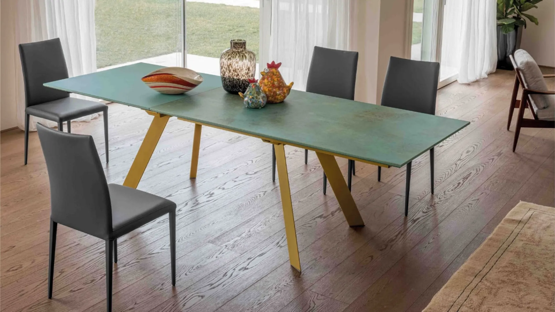 If you are looking for a high-quality dining table, contact us and receive information and quotes on the model shown in the photo. A model like the one in the photo, paired with the right seats, will complete the mood of the rooms in your home dedicated to hospitality. Vertigo extendable table by Altacom: made of durable materials, it is characterized by the bold shapes of the top and a refined and elegant base. The well-known brand Altacom, specialized in the production of ceramic furniture, has chosen for its line a wide range of materials, lines, and colors.