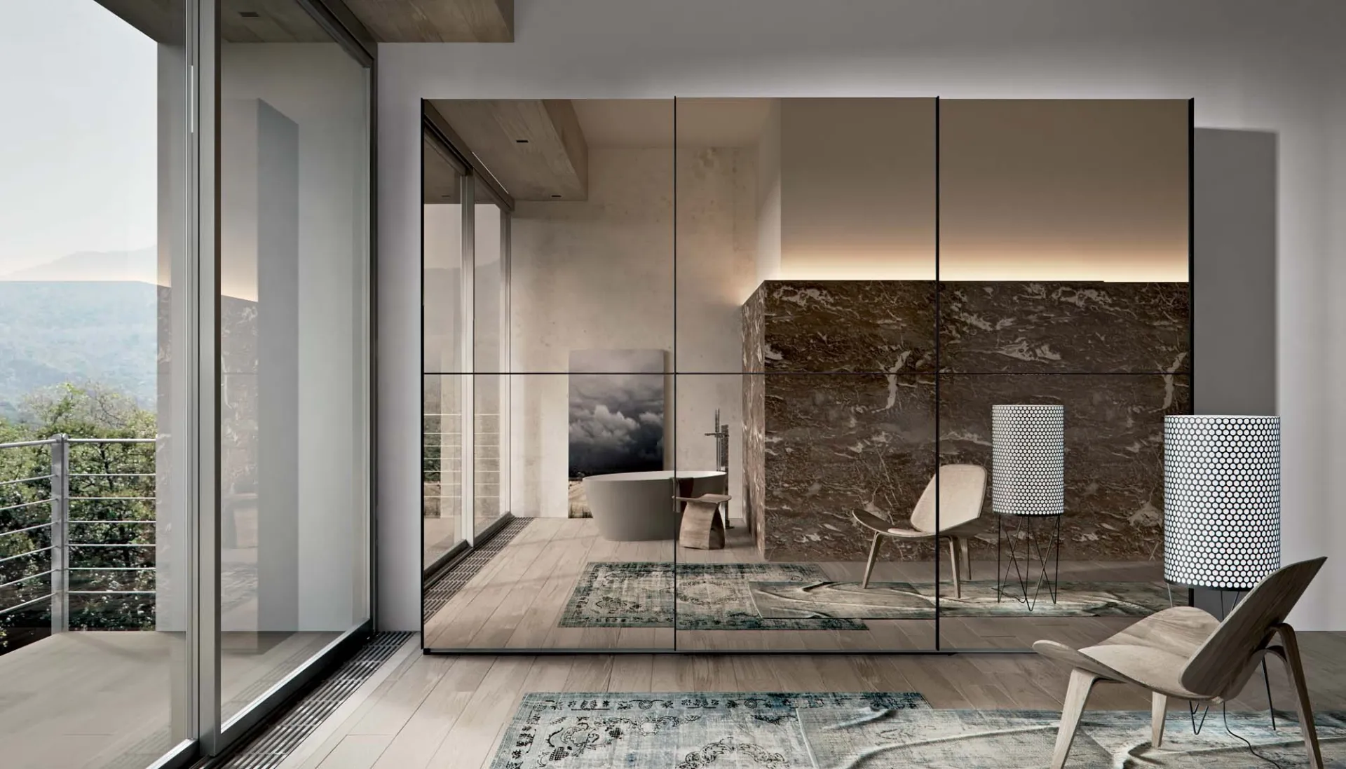 To complete the furnishing project to perfection, choose our proposals of Home Furniture from the best brands, different beds, wardrobes, and nightstands for good taste, size, and finish. Wardrobes and walk-in closets with sliding doors must furnish the bedroom area, ensuring perfect optimization of spaces and exclusive stylistic research. The bedroom is dedicated to rest, so it must be tastefully furnished and complete with furniture and accessory elements capable of creating a always calming atmosphere. Contact us for information and quotes and you can complete the bedroom of your dreams thanks to a diversified range of design storage furniture like this glass wardrobe in the image.