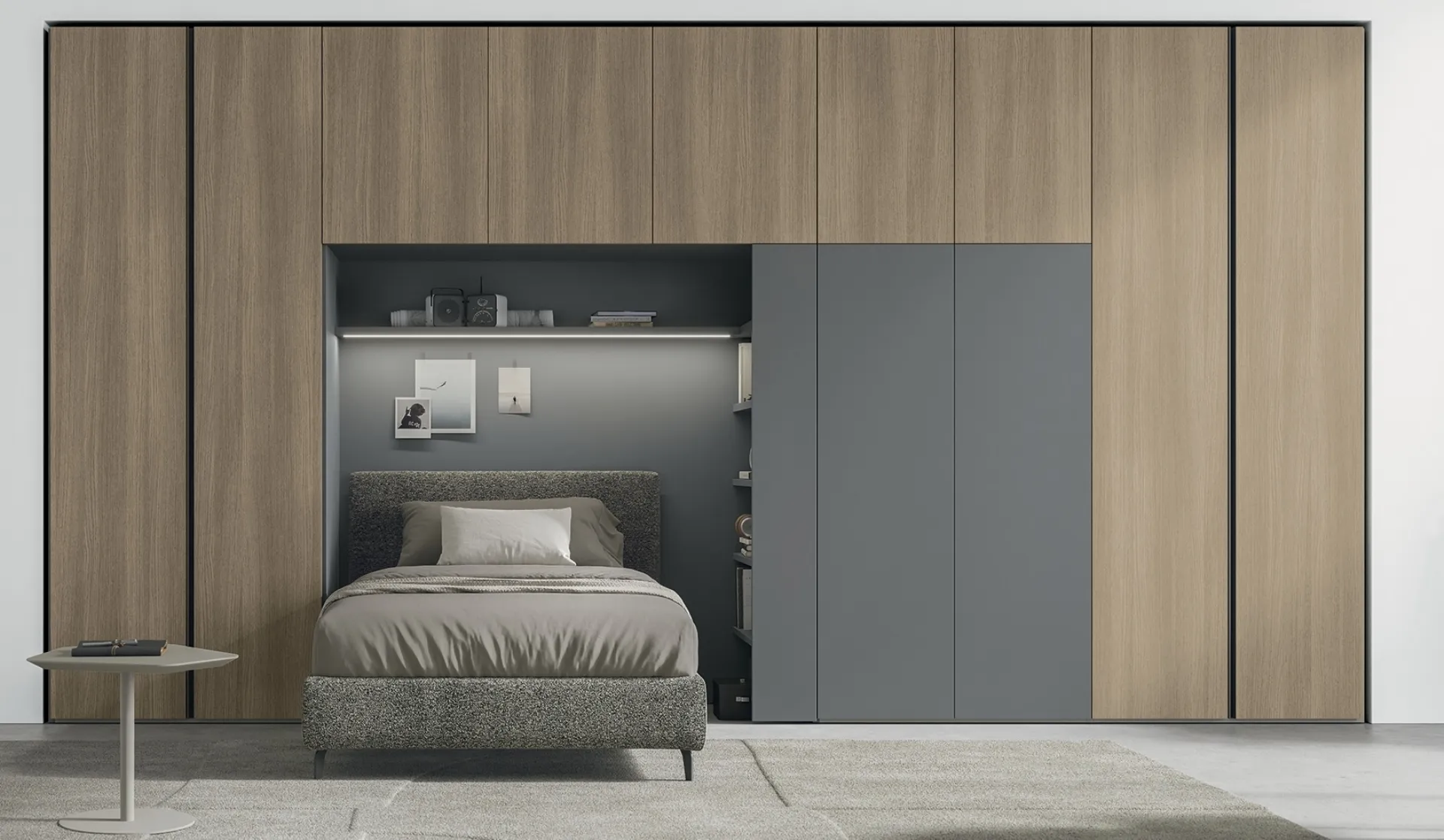To perfectly set up a beautiful and high-quality room, opt for the most original solutions from the best producers, such as beds, wardrobes, and dressers with great design. Modular wardrobes with hinged doors are essential components in the bedroom, to furnish it at its best, functional and complete with everything. Contact us and find out more about our Home Furnishing series: you can complete the bedroom by using a diverse variety of modern containers, like the melamine wardrobe in the photograph.