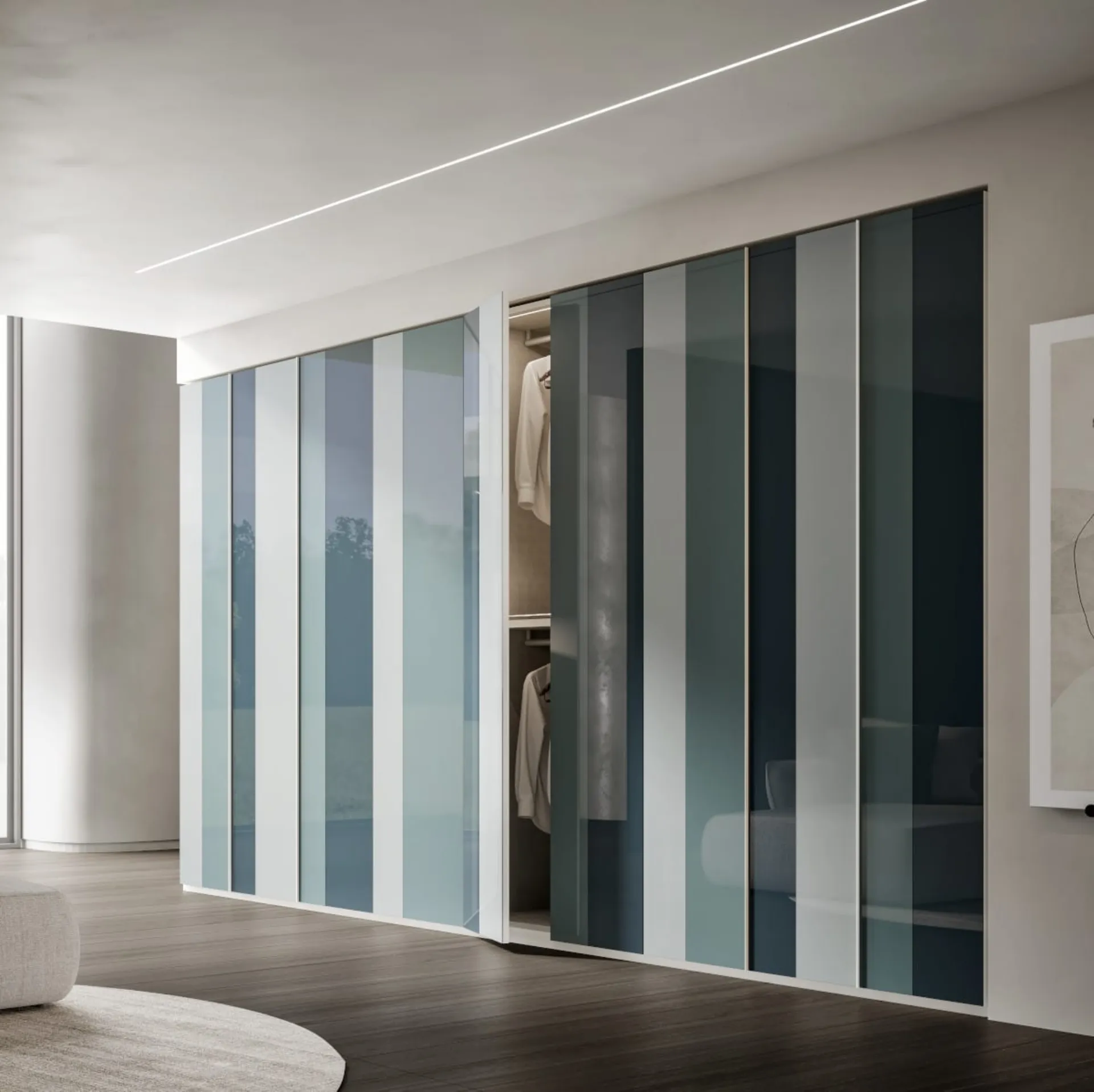 In our collection of wall-mounted design wardrobes with hinged doors, you will also find the model shown in the photo, ideal for those seeking practicality and design. Wardrobe with hinged doors Vela by Veneran: fill out the form for information and quotes and design your home as you have always imagined. Contact us and discover more about a wide range of Home Furnishings to design the bedroom with high-quality glass storage furniture. This product, among the various wall-mounted models with hinged doors from Veneran, is a guarantee of lasting durability, style, and refinement over the years.