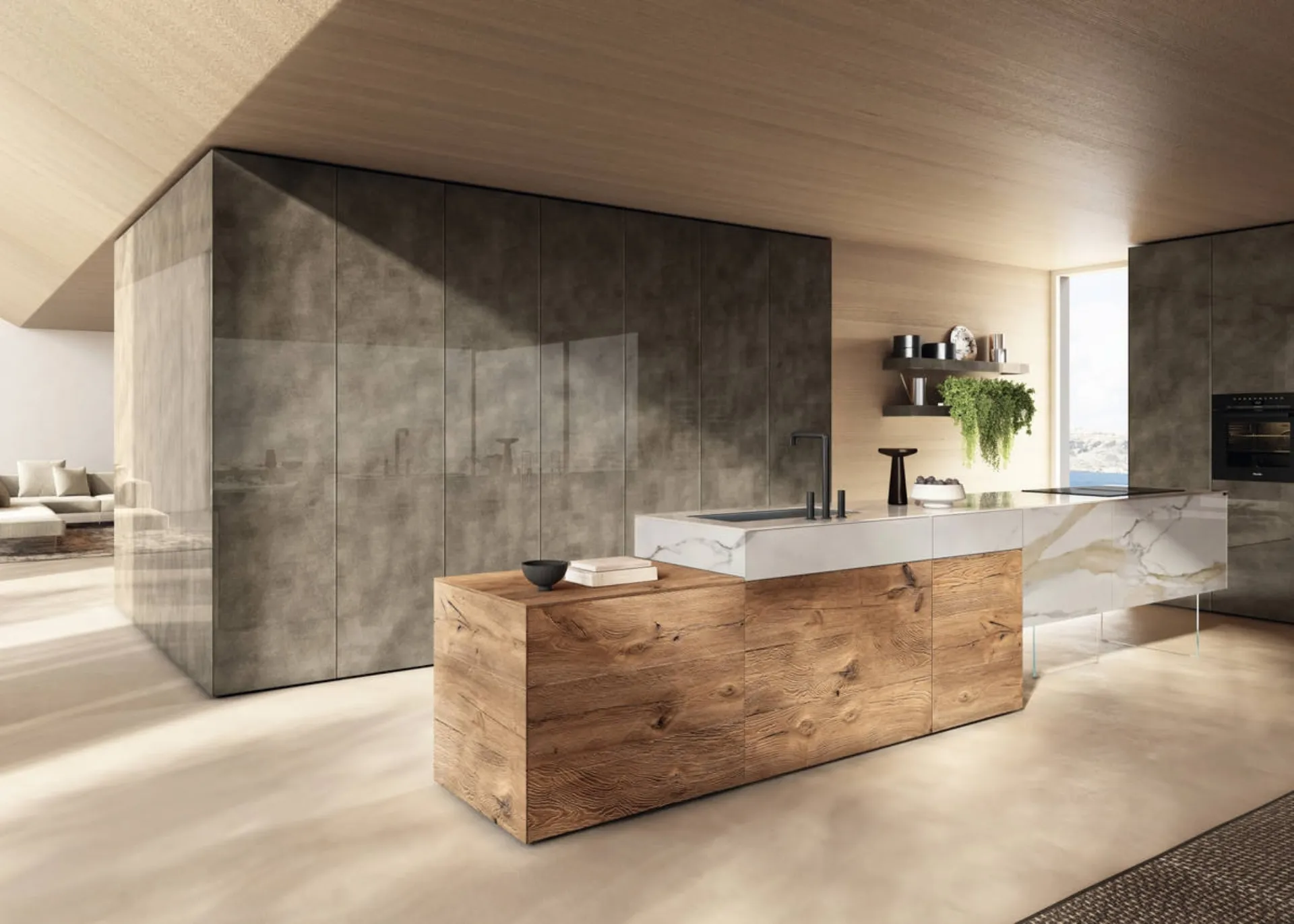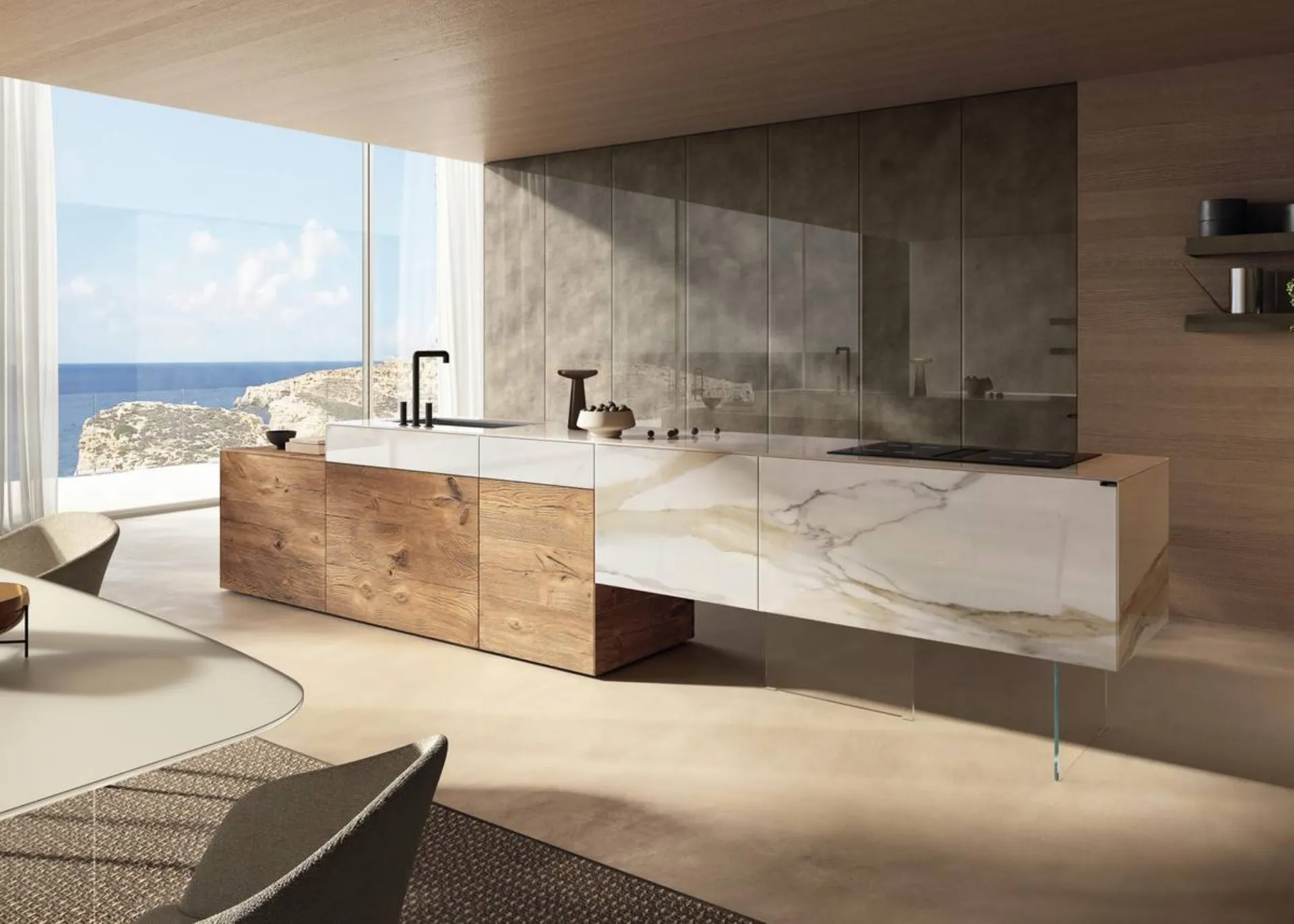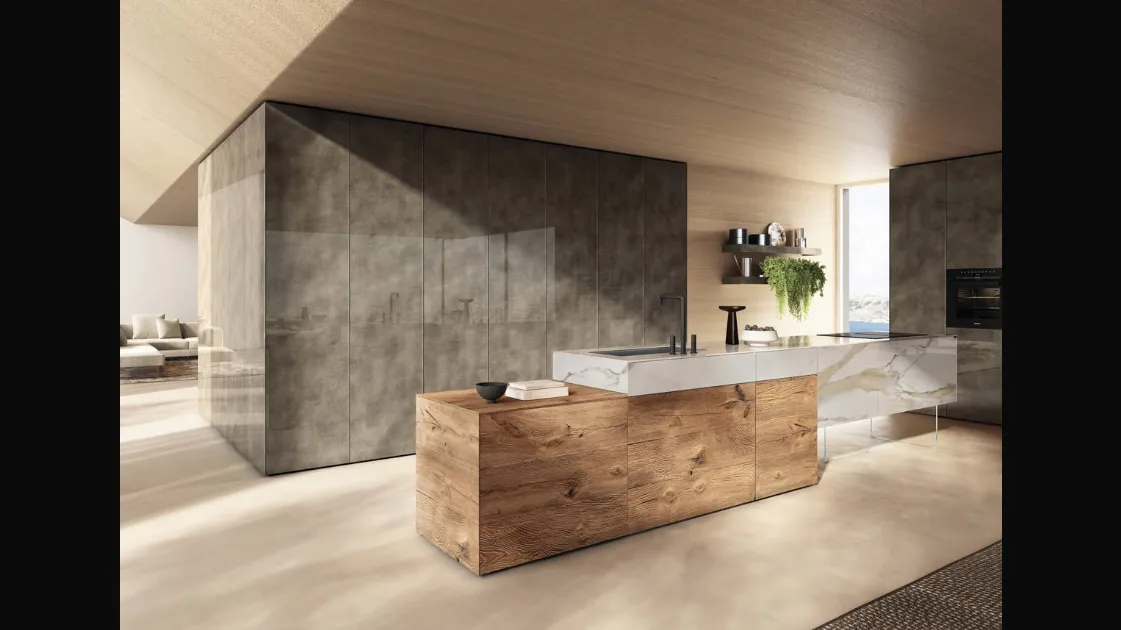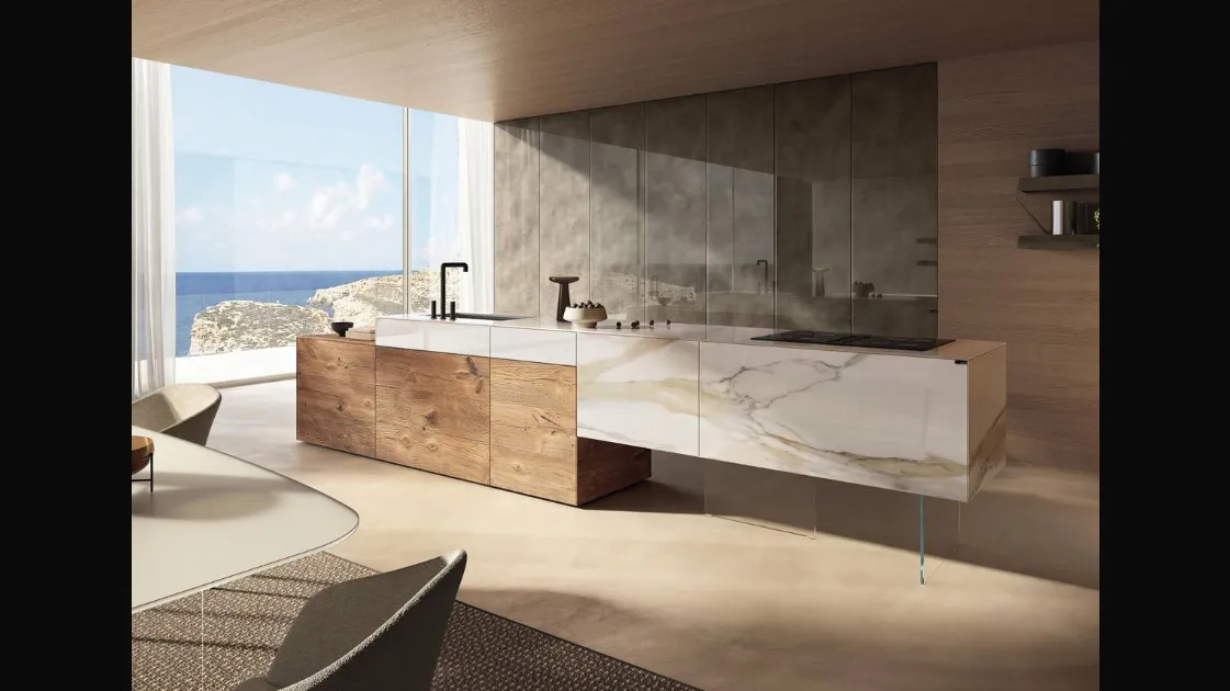 The beautiful glass 36e8 Project 2810 island kitchen by Lago in the photo can be customized in multiple configurations, colors, and finishes with a strong decorative impact. If you are interested in design lines and do not compromise on quality, then our store is the ideal place for you. With Lago furnishing compositions, you can organize your space with rationality, ensuring the functionality you need. Buying a Lago design kitchen allows for extensive customization: you can configure it according to your practical and aesthetic needs. With the brand's island design kitchens, you can fully enhance and furnish your spaces.