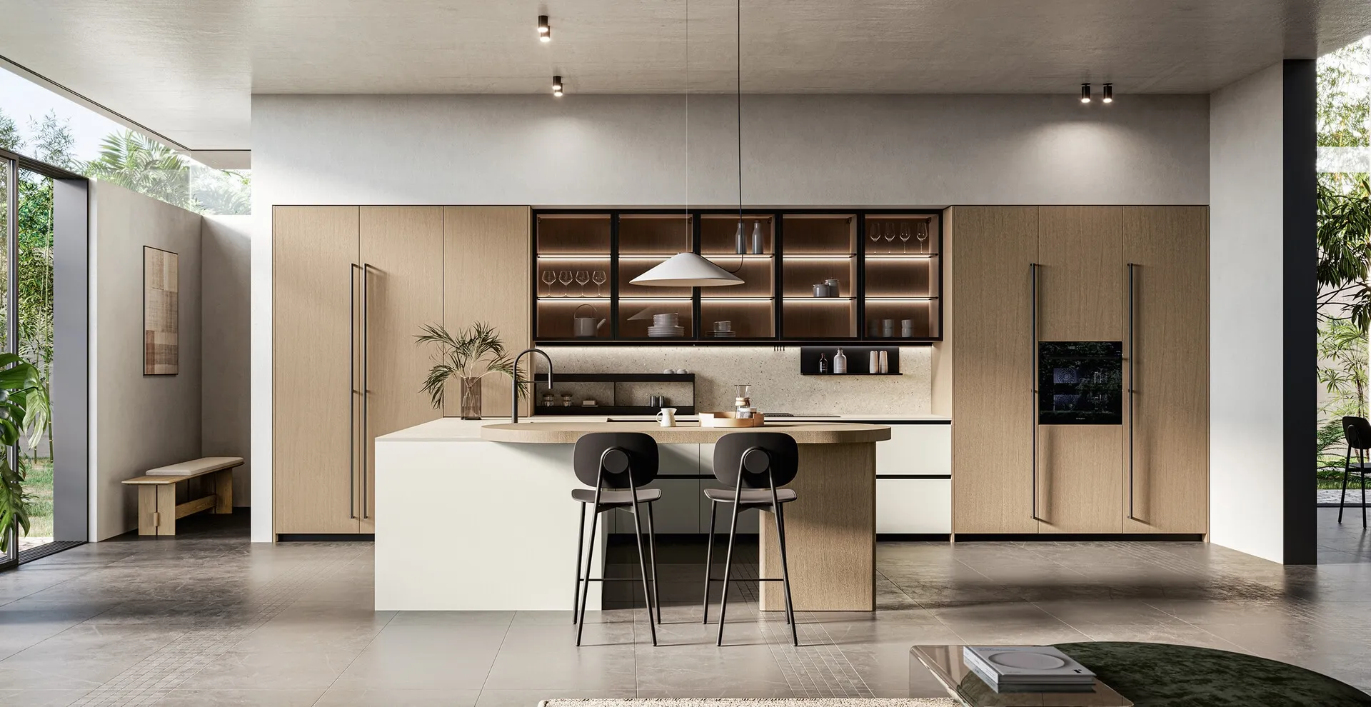 Purchasing one of the Arredo3 Modern Kitchens ensures ample customization and maximum durability: get information on the Modern Kitchen with peninsula Asia 05 by Arredo3. If you are interested in modern compositions and do not want to compromise on the quality guaranteed by the renowned brand, then our showroom is the right place. The model in matte lacquer in the photograph can be customized in multiple layouts, colors, and finishes with a strong aesthetic impact to allow you to interpret the environment with rationality, guaranteeing the functionality and storage capacity you need.